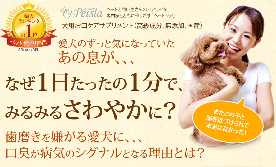 せっかくかわいい愛犬に顔をペロペロされても口が臭いとちょっといやですよね^^:犬の口臭改善に最も効果的なペットシアを今回はご紹介いたします。ペットシアは犬の口臭に最も効果的なサプリメントです。形状はカプセル。これにより数種類の使い方ができます。歯磨き粉として使う直接飲ませるカプセルを開けて粉末を餌に...